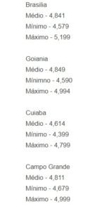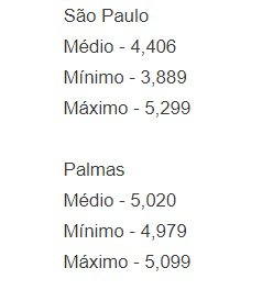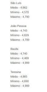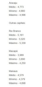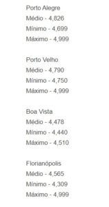 Ademais, apenas o Rio de Janeiro e Palmas têm preços médios acima dos R$ 5, com R$ 5,089 e R$ 5,020 , respectivamente.